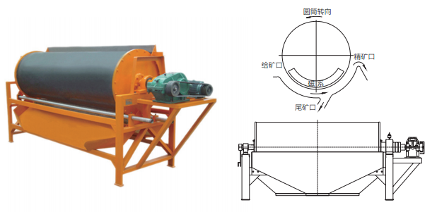 CTS型濕法順流式磁分離機適用于濕式選別礦石粒度為6~0mm的較粗粒度強磁性物料的預(yù)選和精選,或者除去非磁性礦物中混雜的強磁性礦物。本機可以連續(xù)給礦和排礦,磁場強度大,磁場梯度高,工作間隙大,具有較高的處理能力。亦可多臺串連工作。其原理是當(dāng)?shù)V漿進入磁場區(qū)時,其中強磁性礦物被吸附在圓筒表面,弱磁性和非磁性礦物被水流沖洗排出,而吸附在圓筒表面上的磁性礦物隨圓筒旋轉(zhuǎn),被帶出磁場區(qū),用沖洗水沖入精礦槽中,完成分選作業(yè)。