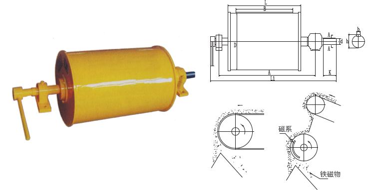CTZ型中場強半磁滾筒(CTZ型中場強全磁滾筒結構與RCT型參數等同),多用于對粉狀、顆粒狀、小塊狀物料的凈化處理,或對鐵質的回收利用,對防止破碎機、研磨機、壓榨機的破壞和磨損起著可靠的保護作用。它安裝方便、吸力強、無能耗、連續工作、操作簡單。根據TD-75型帶式輸送機標準設計,能滿足廣大用戶對高場強、大深度除鐵的使用要求。廣泛應用于冶金、陶瓷、磨料、磨具、金剛砂、非金屬礦、耐火材料、礦山、食品、化工、玻璃、建材等行業。二、示意圖
