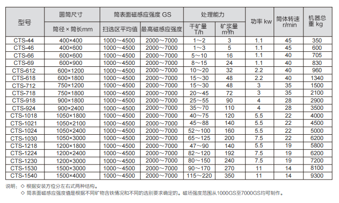 CTS型濕法順流式磁分離機適用于濕式選別礦石粒度為6~0mm的較粗粒度強磁性物料的預選和精選,或者除去非磁性礦物中混雜的強磁性礦物。本機可以連續給礦和排礦,磁場強度大,磁場梯度高,工作間隙大,具有較高的處理能力。亦可多臺串連工作。其原理是當礦漿進入磁場區時,其中強磁性礦物被吸附在圓筒表面,弱磁性和非磁性礦物被水流沖洗排出,而吸附在圓筒表面上的磁性礦物隨圓筒旋轉,被帶出磁場區,用沖洗水沖入精礦槽中,完成分選作業。